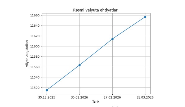 Mərkəzi Bankın açıqladığı rəsmi məlumatlara görə, 30 dekabr 2025-ci il tarixində 11 milyard 514,9 milyon ABŞ dolları təşkil edən ehtiyatlar, 31 mart 2026-cı il tarixinə 11 milyard 656,8 milyon dollara çatıb.