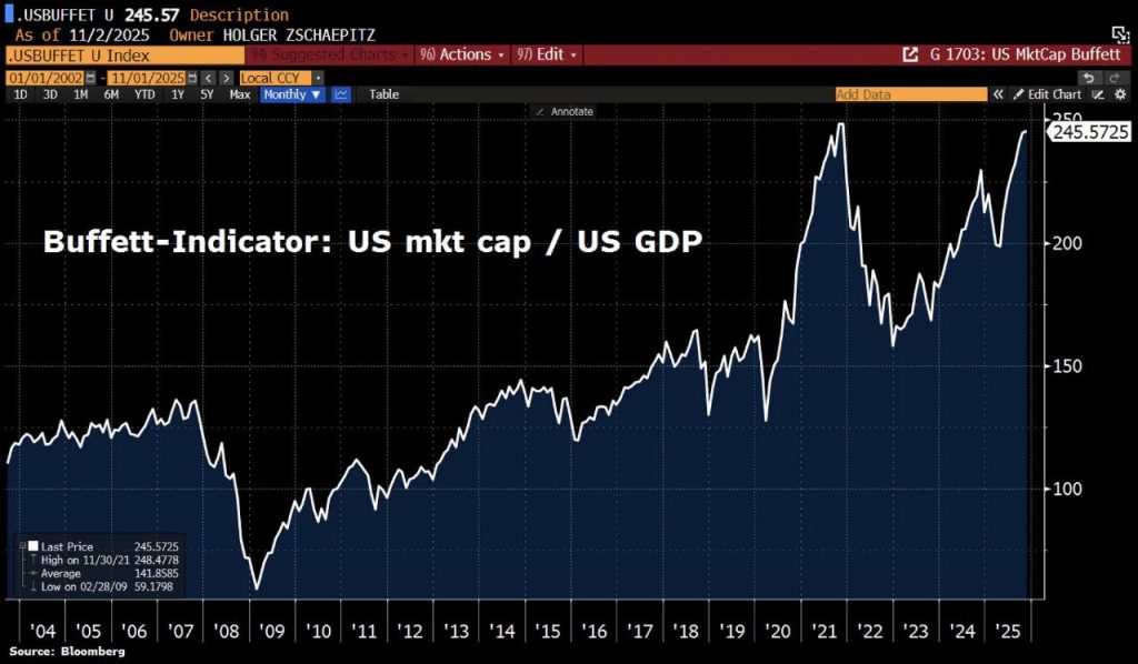 ABŞ fond bazarı ÜDM-in 245%-i təşkil edir ki, bu da Buffettin 100%-lik “köpük meyarı”dan yüksəkdir05 Noyabr 2025