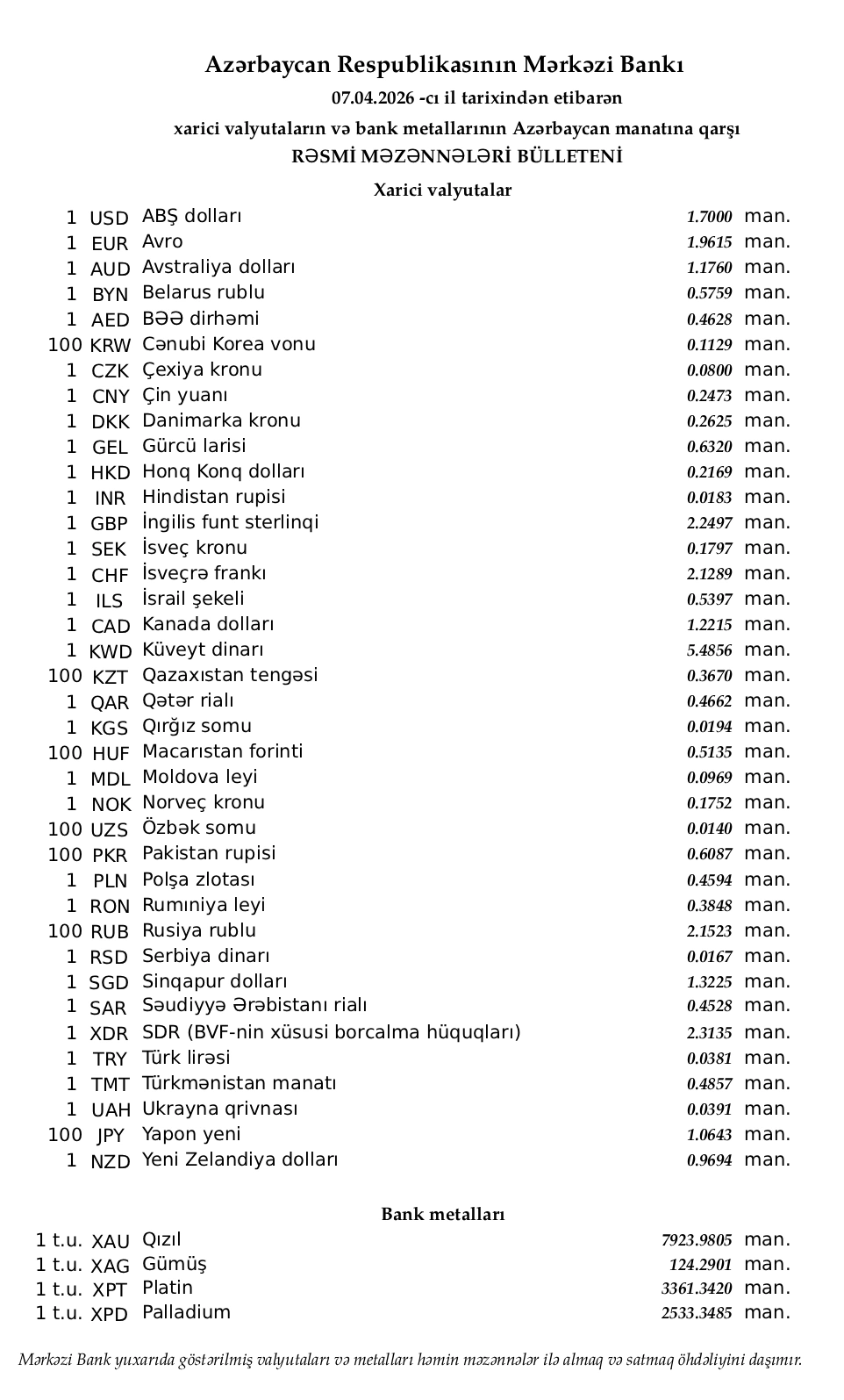 07.04.2026-cı il tarixində Azərbaycan Mərkəzi Bankının rəsmi məzənnələrində əsasən ötən günə nisbətən cüzi dəyişikliklər qeydə alınıb. GDP Mərkəzi Banka istinadla xəbər verir ki, bu gün ölkəmizdə ABŞ dollarının məzənnəsi sabit qalaraq 1.7000 manat təşkil edib (0.00%). Avro 1.9590 manatdan 1.9615 manata yüksələrək 0.0025 manat və ya 0.13% artıb.