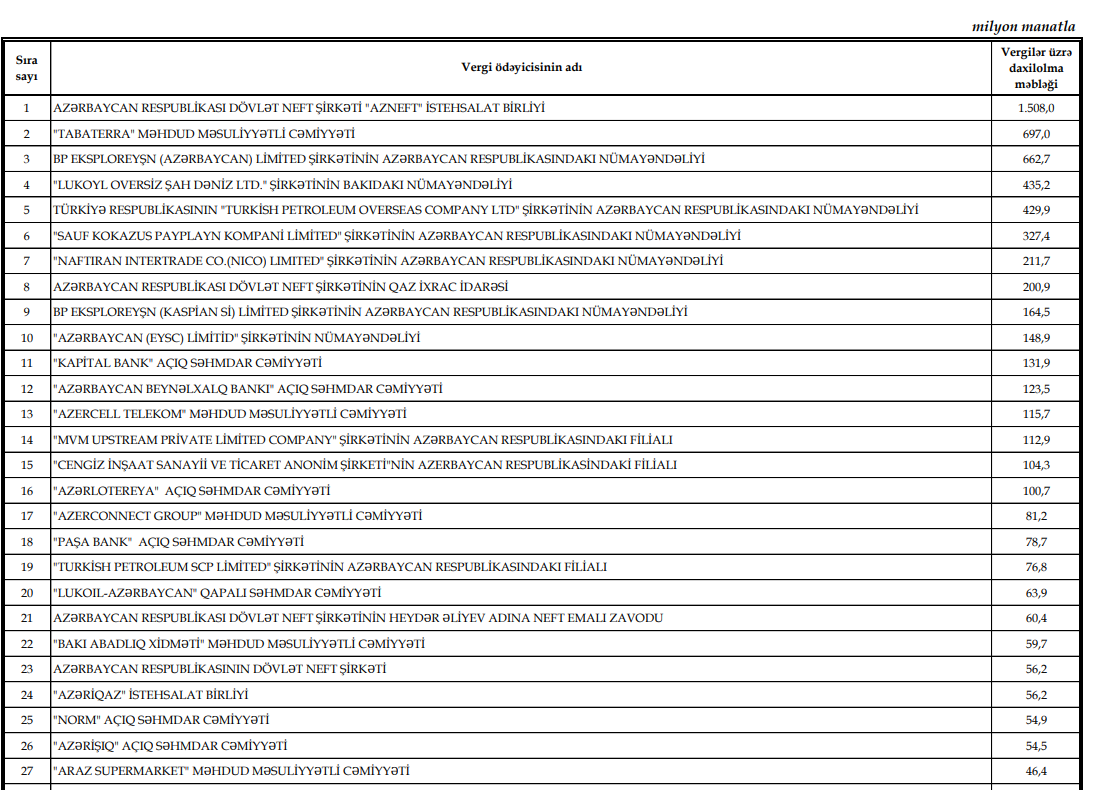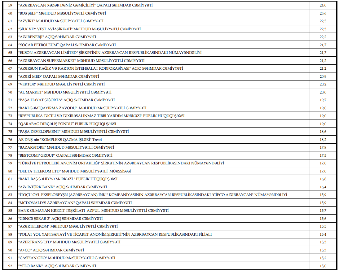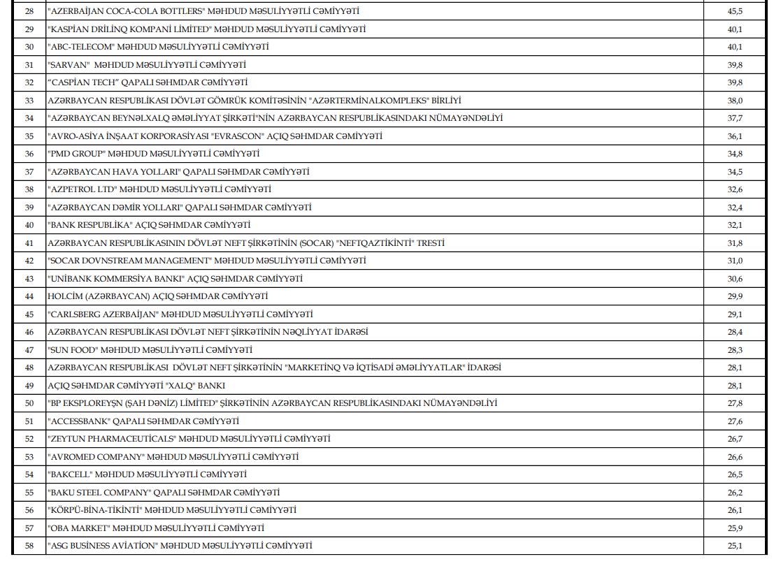 2025-ci ildə ən çox vergi ödəyən və bu barədə məlumatın açıqlanmasına razılıq verən 100 vergi ödəyicisi (büdcə təşkilatları istisna olmaqla)