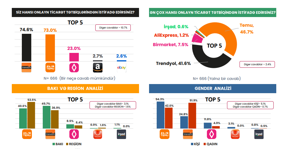 Araşdırmanın əsas nəticələrindən biri onlayn ticarət tətbiqləri arasında liderliyin müəyyən edilməsidir. Nəticələrə görə, Trendyol 74,6% ilə ən çox istifadə edilən platforma kimi ön sırada yer alır. Onu 73% göstərici ilə Temu yaxından təqib edir. Bu iki platforma arasındakı cüzi fərq bazarda rəqabətin intensivliyini əks etdirir. Birmarket 23% ilə üçüncü yerdə qərarlaşır. Dünya nəhəngləri Amazon (2,7%) və eBay (2,6%) isə Azərbaycan bazarında hələ də güclü mövqe qazana bilməyib.