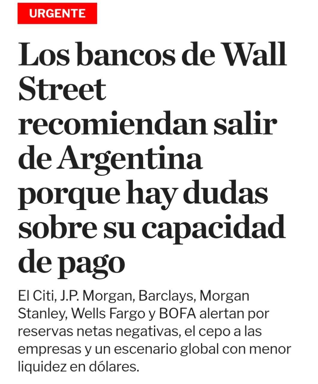 Citi, JP Morgan, Barclays, Morgan Stanley, Wells Fargo və Bank of America analitikləri bildirirlər ki, Argentinanın xalis beynəlxalq ehtiyatları mənfi göstəricidədir və bu vəziyyət ölkənin ödəniş qabiliyyəti ilə bağlı riskləri artırır.